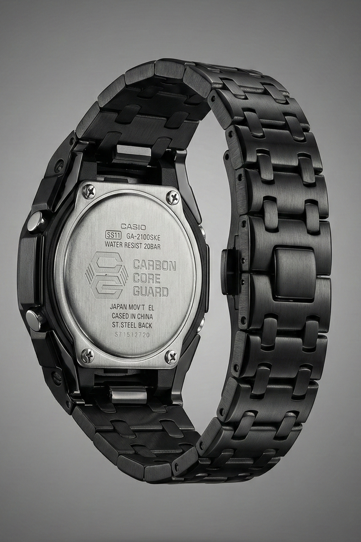 Noir intégral, lueur verte venimeuse. La G‑Shock "Venom Strike" associe un boîtier noir brossé, un bracelet métal noir et des accents verts qui percent l'obscurité comme un signal nocturne. Un look agressif et maîtrisé pour les amateurs de style dark tech.